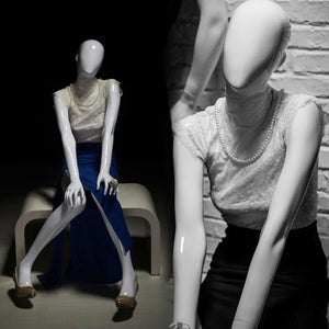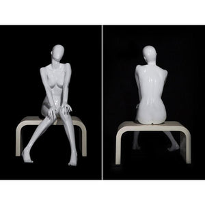 This female mannequin is stunning. She is in a sitting pose with her legs together as if she is a model in a photoshoot. Her stylistic pose allows her to wear any type of clothing and the angles that she creates with her body boldly state fashion and design.