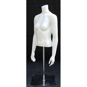 • This female mannequin torso is perfect for displaying all of your beautiful shirts and tops! The female torso has a smooth, glossy finish that can be used for anything whether it's high end or low end. The glossy white color is beautiful and will look great showing off all of your tops.