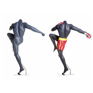 The MM-BOXING-3 is part of our premium sports and athletic mannequin series. In this specific pose he is kicking up his knee as if he were in a MMA or kickboxing match.