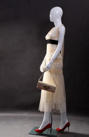 We love this mannequin over here at Mannequin Mall! This glossy egghead mannequin looks so confident like she's walking down the catwalk! This style pose is one of our customers' favorites, and she will look amazing in any type of clothing you put her in.